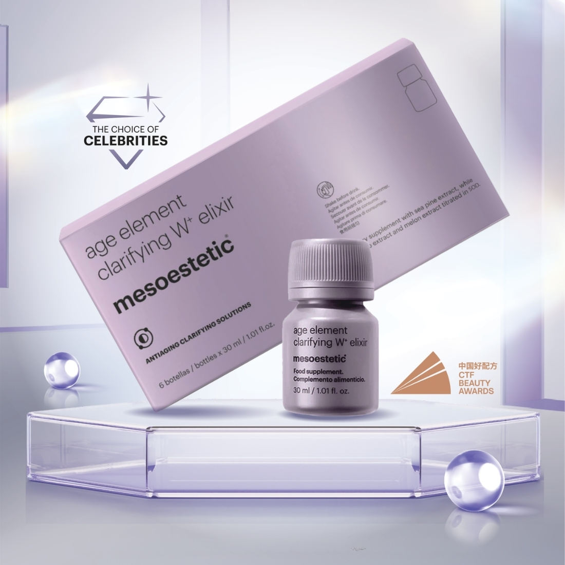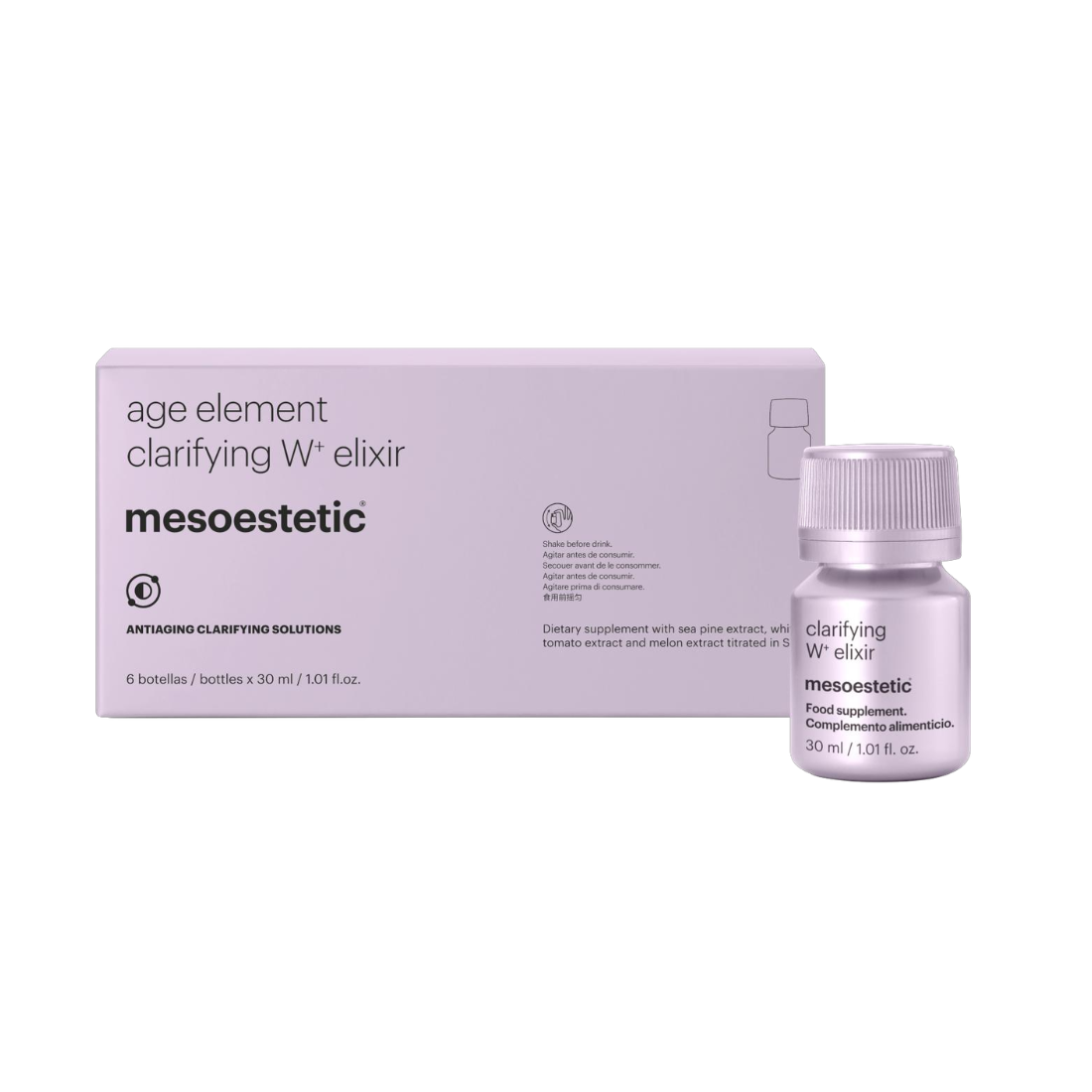 Mesoestetic Age Element Clarifying W+ Elixir (6 x 30ml) is a luxurious nutricosmetic supplement formulated to enhance your skin’s natural radiance and promote a more even, luminous complexion from within. This drinkable elixir works deep inside to help minimise the appearance of pigmentation and support skin tone uniformity — perfect for those wanting to brighten dullness and improve overall glow.